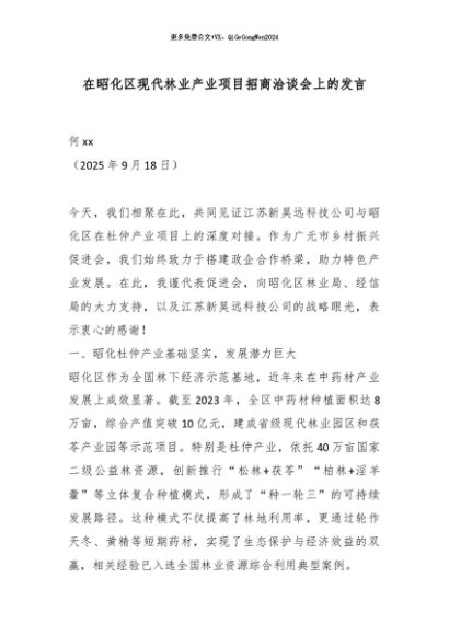 【七哥公文】2025年:在昭化区现代林业产业项目招商洽谈会上的发言_副本+更多免费公文+VX:QiGeGongWen2024