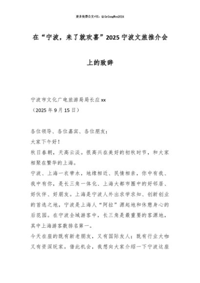 【七哥公文】2025年:在“宁波,来了就欢喜”2025宁波文旅推介会上的致辞_副本+更多免费公文+VX:QiGeGongWen2024