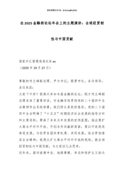 【七哥公文】2025年:在2025金融街论坛年会上的主题演讲:全球经贸韧性与中国贡献_副本+更多免费公文+VX:QiGeGongWen2024