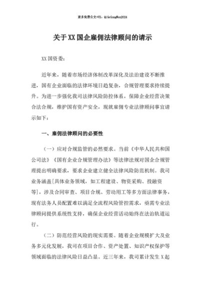【七哥公文】2025年:关于XX国企雇佣法律顾问的请示+更多免费公文+VX:QiGeGongWen2024