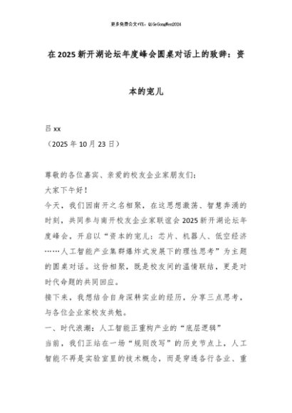 【七哥公文】2025年:在2025新开湖论坛年度峰会圆桌对话上的致辞:资本的宠儿_副本+更多免费公文+VX:QiGeGongWen2024