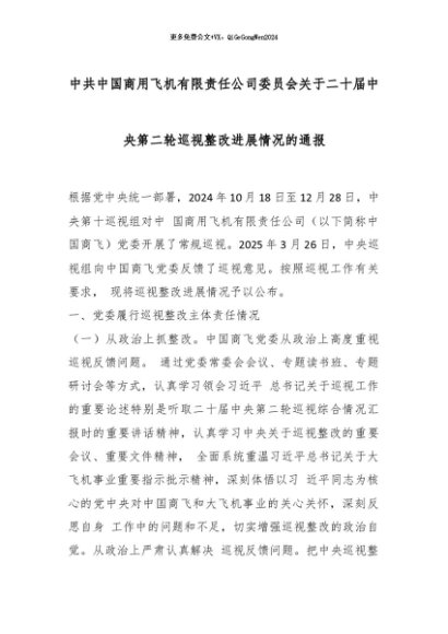 【七哥公文】2025年:中共中国商用飞机有限责任公司委员会关于二十届中央第二轮巡视整改进展情况的通报_副本+更多免费公文+VX:QiGeGongWen2024