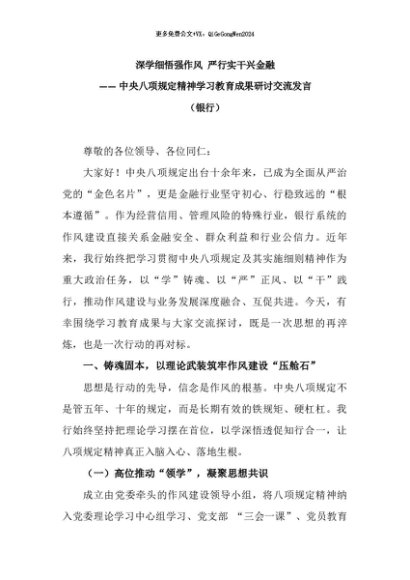 【七哥公文】2025年:中央八项规定精神学习教育成果研讨交流发言(银行):深学细悟强作风 严行实干兴金融+更多免费公文+VX:QiGeGongWen2024