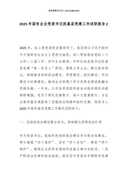 【七哥公文】2025年:2025年国有企业党委书记抓基层党建工作述职报告2_副本+更多免费公文+VX:QiGeGongWen2024
