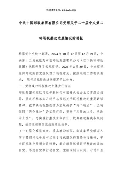 【七哥公文】2025年:中共中国邮政集团有限公司党组关于二十届中央第二轮巡视整改进展情况的通报_副本+更多免费公文+VX:QiGeGongWen2024