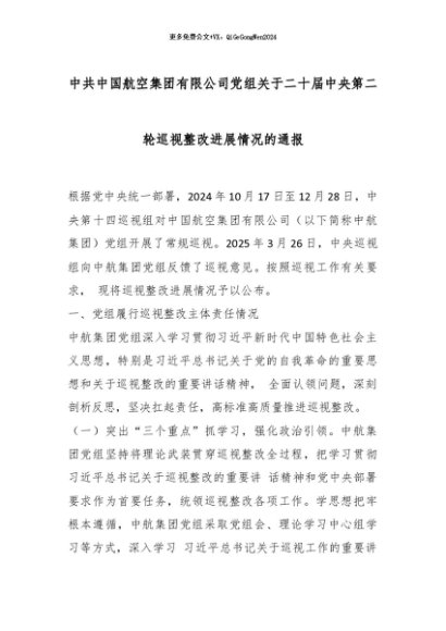 【七哥公文】2025年:中共中国航空集团有限公司党组关于二十届中央第二轮巡视整改进展情况的通报_副本+更多免费公文+VX:QiGeGongWen2024