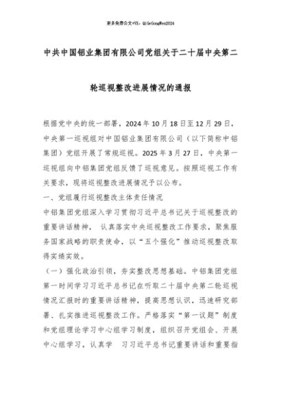 【七哥公文】2025年:中共中国铝业集团有限公司党组关于二十届中央第二轮巡视整改进展情况的通报_副本+更多免费公文+VX:QiGeGongWen2024