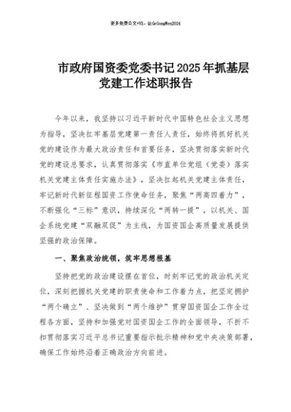 【七哥公文】2025年:市政府国资委党委书记2025年抓基层党建工作述职报告+更多免费公文+VX:QiGeGongWen2024