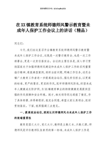 【七哥公文】2025年:在XX镇教育系统师德师风警示教育暨未成年人保护工作会议上的讲话(精品)+更多免费公文+VX:QiGeGongWen2024