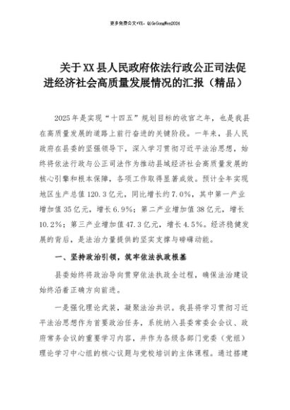 【七哥公文】2025年:关于XX县人民政府依法行政公正司法促进经济社会高质量发展情况的汇报(精品)+更多免费公文+VX:QiGeGongWen2024