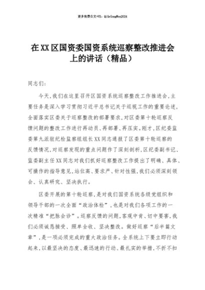 【七哥公文】2025年:在XX区国资委国资系统巡察整改推进会上的讲话(精品)+更多免费公文+VX:QiGeGongWen2024