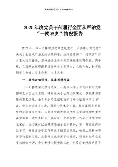 【七哥公文】2025年:2025年度党员干部履行全面从严治党“一岗双责”情况报告+更多免费公文+VX:QiGeGongWen2024