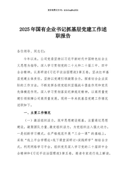 / 【七哥公文】2025年:2025年国有企业书记抓基层党建工作述职报告+更多免费公文+VX:QiGeGongWen2024