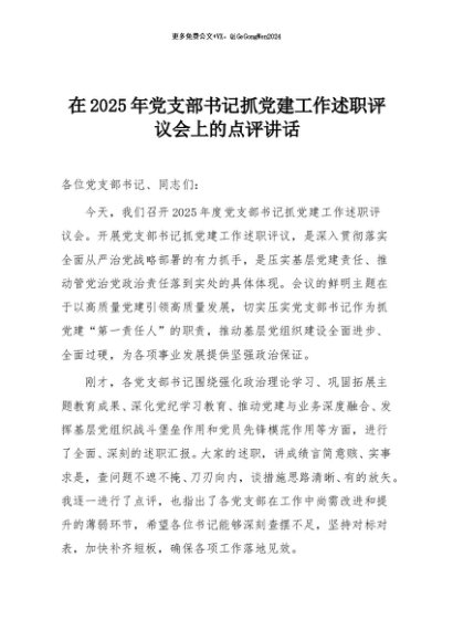 【七哥公文】2025年:在2025年党支部书记抓党建工作述职评议会上的点评讲话+更多免费公文+VX:QiGeGongWen2024