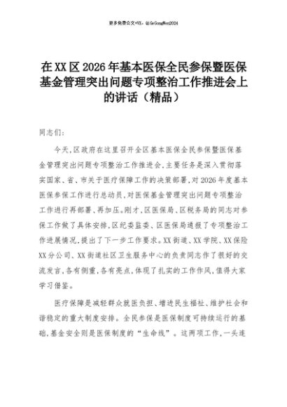 【七哥公文】2025年:在XX区2026年基本医保全民参保暨医保基金管理突出问题专项整治工作推进会上的讲话(精品)+更多免费公文+VX:QiGeGongWen2024