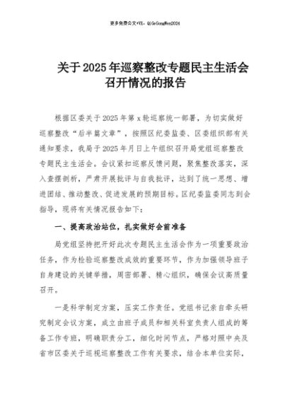 / 【七哥公文】2025年:关于2025年巡察整改专题民主生活会召开情况的报告+更多免费公文+VX:QiGeGongWen2024