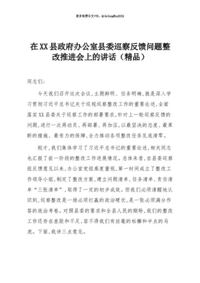 【七哥公文】2025年:在XX县政府办公室县委巡察反馈问题整改推进会上的讲话(精品)+更多免费公文+VX:QiGeGongWen2024