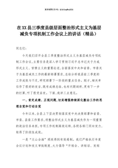 【七哥公文】2025年:在XX县三季度县级层面整治形式主义为基层减负专项机制工作会议上的讲话(精品)+更多免费公文+VX:QiGeGongWen2024
