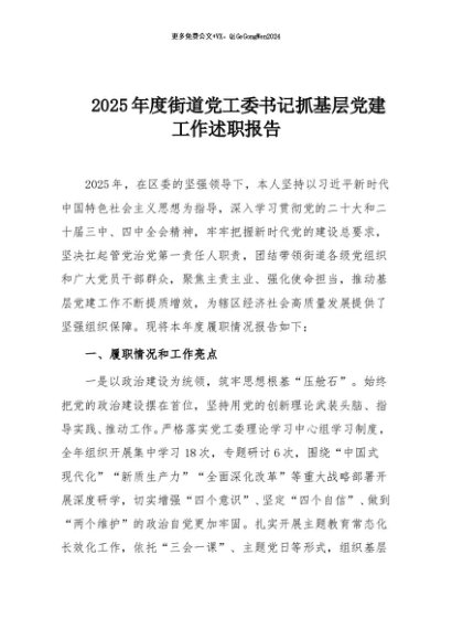 / 【七哥公文】2025年:2025年度街道党工委书记抓基层党建工作述职报告+更多免费公文+VX:QiGeGongWen2024