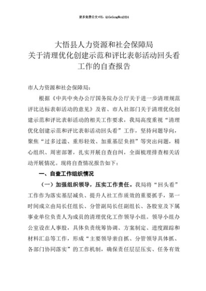 【七哥公文】2025年:大悟县人力资源和社会保障局关于清理优化创建示范和评比表彰活动回头看工作的自查报告+更多免费公文+VX:QiGeGongWen2024