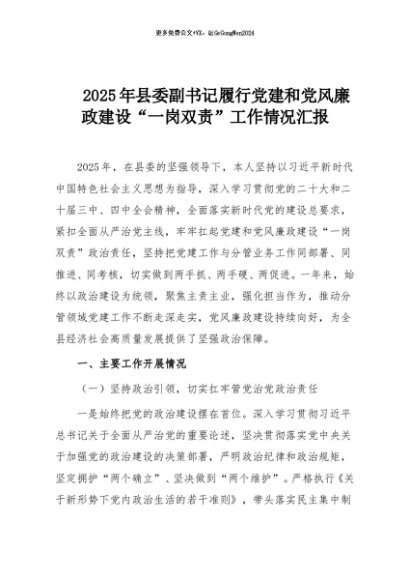 【七哥公文】2025年:2025年县委副书记履行党建和党风廉政建设“一岗双责”工作情况汇报+更多免费公文+VX:QiGeGongWen2024