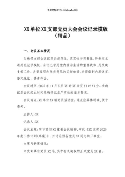 / 【七哥公文】2025年:XX单位XX支部党员大会会议记录模版(精品)+更多免费公文+VX:QiGeGongWen2024