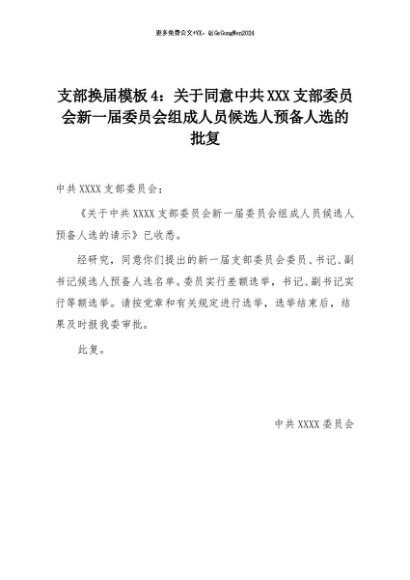 【七哥公文】2025年:支部换届模板4:关于同意中共XXX支部委员会新一届委员会组成人员候选人预备人选的批复+更多免费公文+VX:QiGeGongWen2024