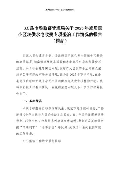 【七哥公文】2025年:XX县市场监督管理局关于2025年度居民小区转供水电收费专项整治工作情况的报告(精品)+更多免费公文+VX:QiGeGongWen2024