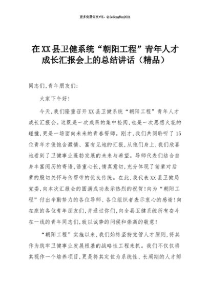 【七哥公文】2025年:在XX县卫健系统“朝阳工程”青年人才成长汇报会上的总结讲话(精品)+更多免费公文+VX:QiGeGongWen2024