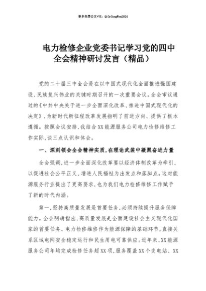 【七哥公文】2025年:电力检修企业党委书记学习党的四中全会精神研讨发言(精品)+更多免费公文+VX:QiGeGongWen2024