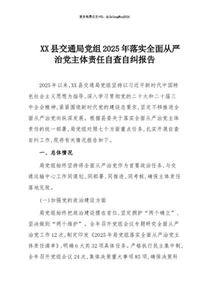 【七哥公文】2025年:XX县交通局党组2025年落实全面从严治党主体责任自查自纠报告+更多免费公文+VX:QiGeGongWen2024