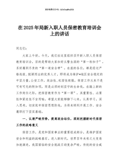 / 【七哥公文】2025年:在2025年局新入职人员保密教育培训会上的讲话+更多免费公文+VX:QiGeGongWen2024