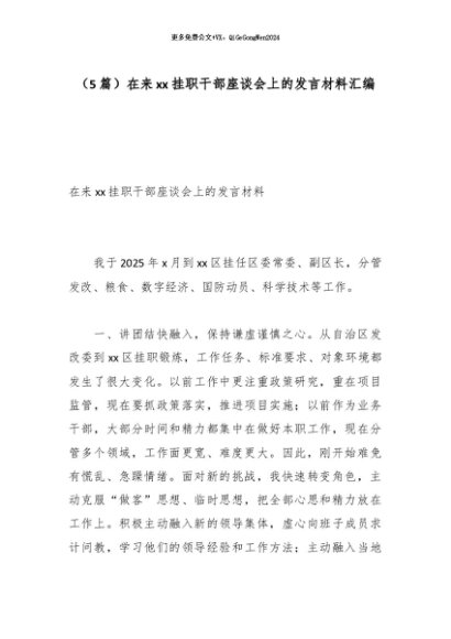 / 【七哥公文】2025年:(5篇)在来xx挂职干部座谈会上的发言材料汇编+更多免费公文+VX:QiGeGongWen2024