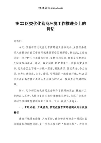 / 【七哥公文】2025年:在XX区委优化营商环境工作推进会上的讲话+更多免费公文+VX:QiGeGongWen2024