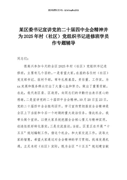 【七哥公文】2025年:某区委书记宣讲党的二十届四中全会精神并为2025年村(社区)党组织书记进修班学员作专题辅导+更多免费公文+VX:QiGeGongWen2024