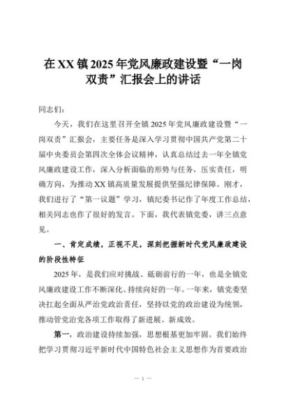 【七哥公文】2025年:在XX镇2025年党风廉政建设暨“一岗双责”汇报会上的讲话+更多免费公文+VX:QiGeGongWen2024