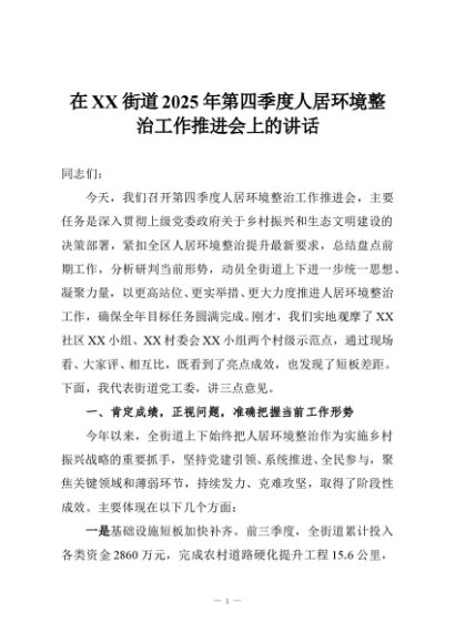 【七哥公文】2025年:在XX街道2025年第四季度人居环境整治工作推进会上的讲话+更多免费公文+VX:QiGeGongWen2024