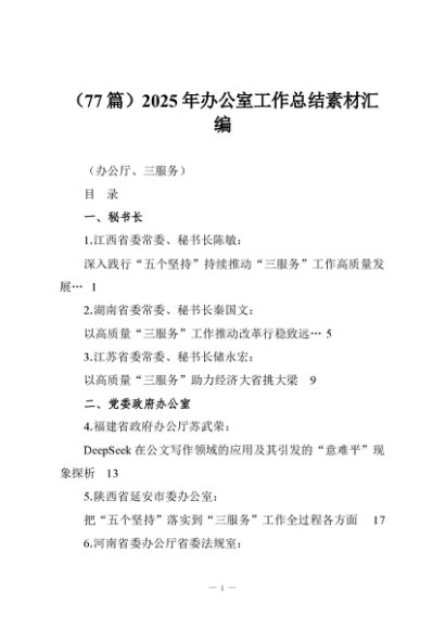 【七哥公文】2025年:(77篇)2025年办公室工作总结素材汇编(办公厅、三服务)+更多免费公文+VX:QiGeGongWen2024