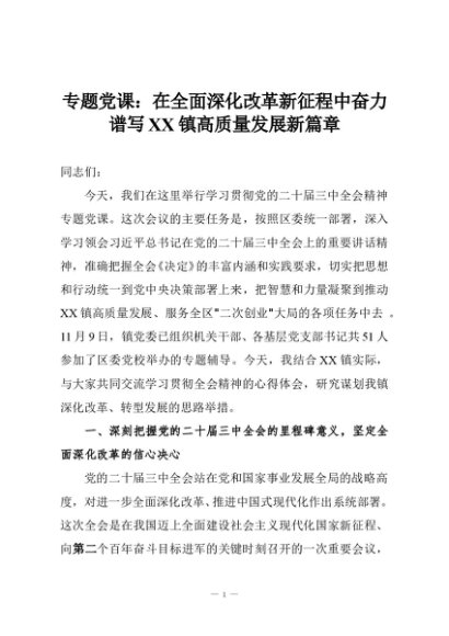 【七哥公文】2025年:专题党课:在全面深化改革新征程中奋力谱写XX镇高质量发展新篇章+更多免费公文+VX:QiGeGongWen2024
