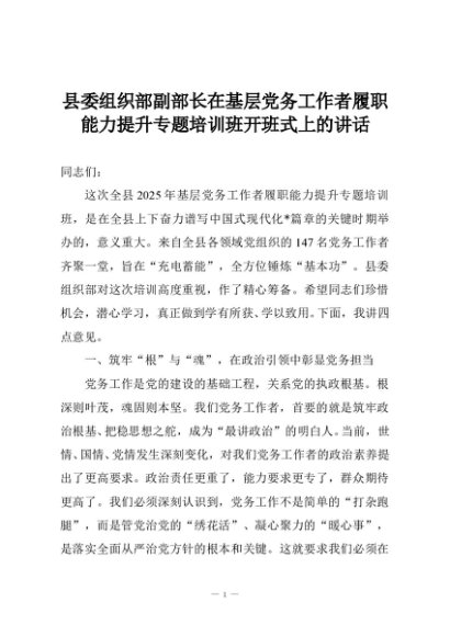 【七哥公文】2025年:县委组织部副部长在基层党务工作者履职能力提升专题培训班开班式上的讲话+更多免费公文+VX:QiGeGongWen2024