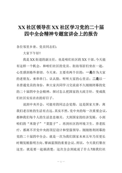 【七哥公文】2025年:XX社区领导在XX社区学习党的二十届四中全会精神专题宣讲会上的报告+更多免费公文+VX:QiGeGongWen2024