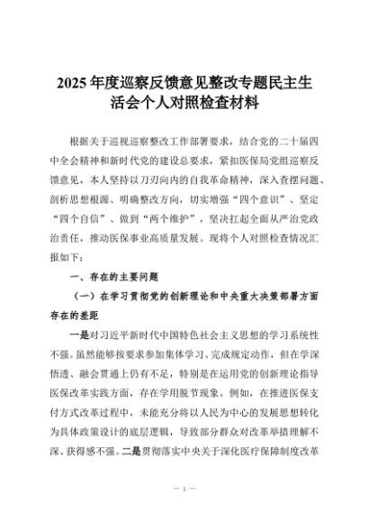 【七哥公文】2025年:2025年度巡察反馈意见整改专题民主生活会个人对照检查材料+更多免费公文+VX:QiGeGongWen2024