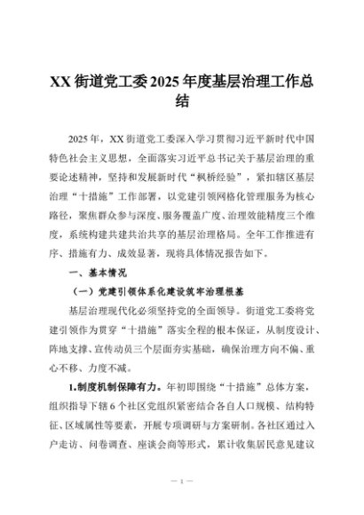 / 【七哥公文】2025年:XX街道党工委2025年度基层治理工作总结+更多免费公文+VX:QiGeGongWen2024