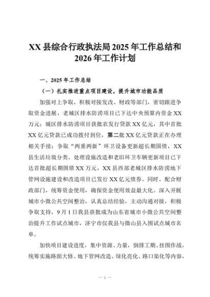 【七哥公文】2025年:XX县综合行政执法局2025年工作总结和2026年工作计划+更多免费公文+VX:QiGeGongWen2024