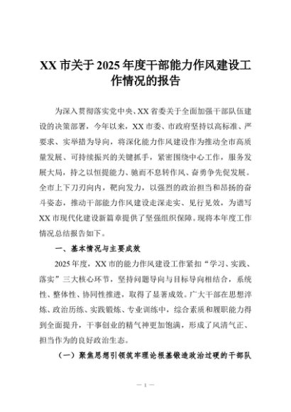 【七哥公文】2025年:XX市关于2025年度干部能力作风建设工作情况的报告+更多免费公文+VX:QiGeGongWen2024