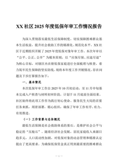/ 【七哥公文】2025年:XX社区2025年度低保年审工作情况报告+更多免费公文+VX:QiGeGongWen2024