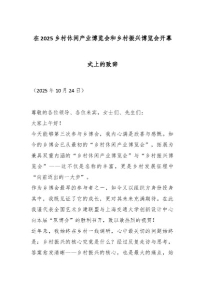 【七哥公文】2025年:在2025乡村休闲产业博览会和乡村振兴博览会开幕式上的致辞_副本+更多免费公文+VX:QiGeGongWen2024