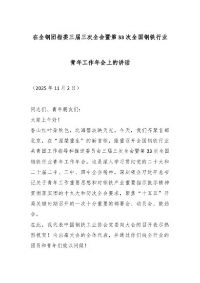 【七哥公文】2025年:在全钢团指委三届三次全会暨第33次全国钢铁行业青年工作年会上的讲话_副本+更多免费公文+VX:QiGeGongWen2024
