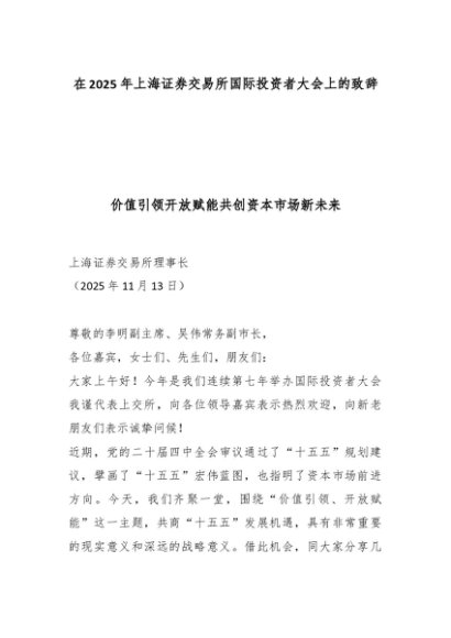 【七哥公文】2025年:在2025年上海证券交易所国际投资者大会上的致辞_副本+更多免费公文+VX:QiGeGongWen2024