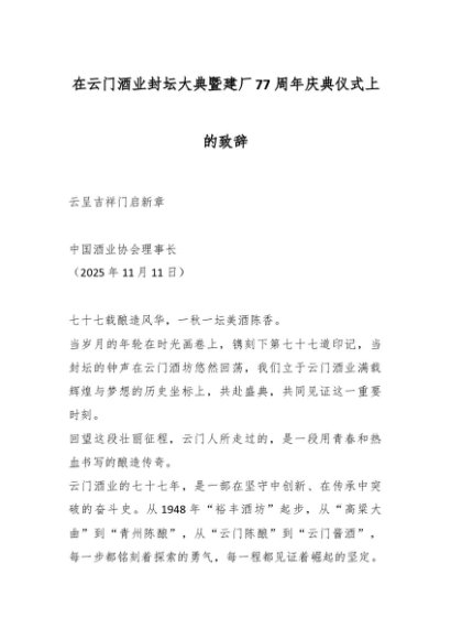 【七哥公文】2025年:在云门酒业封坛大典暨建厂77周年庆典仪式上的致辞_副本+更多免费公文+VX:QiGeGongWen2024